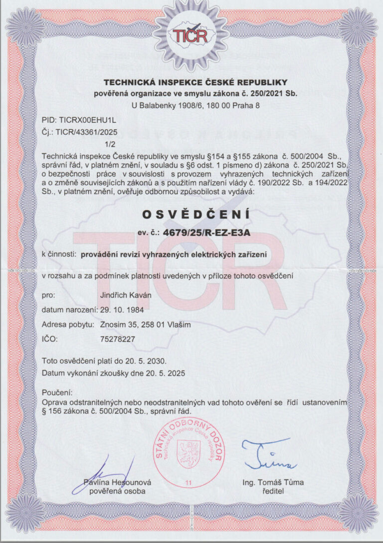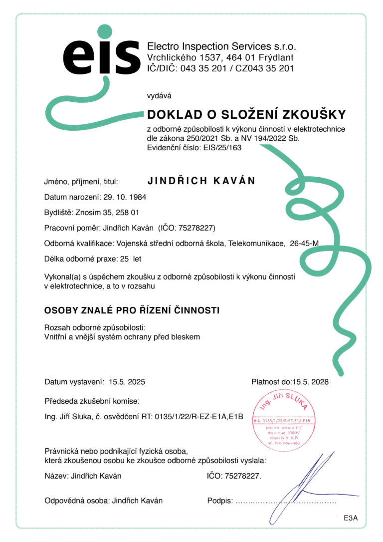 Výsledek je dobře odvedená práce dle požadavků zákazníka a požadavků českých právních předpisů a norem, kterou stvrzuji revizní zprávou. Tím přebírám právní zodpovědnost za funkčnost zařízení na následující čtyři roky. Z tohoto důvodu se s reklamacemi téměř nesetkávám.